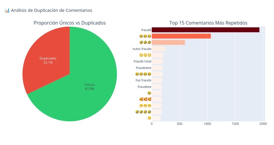 "Este bloque agrupa los 16.083 comentarios idénticos o duplicados. Su único propósito es amplificar artificialmente la narrativa del "fraude" y la desconfianza ("fraude, fraude, fraude", "sirepre cayó a las…"). Es una operación de influencia, no una opinión", detalla parte de las conclusiones del meta análisis descriptivo de la empresa omendata.pro.